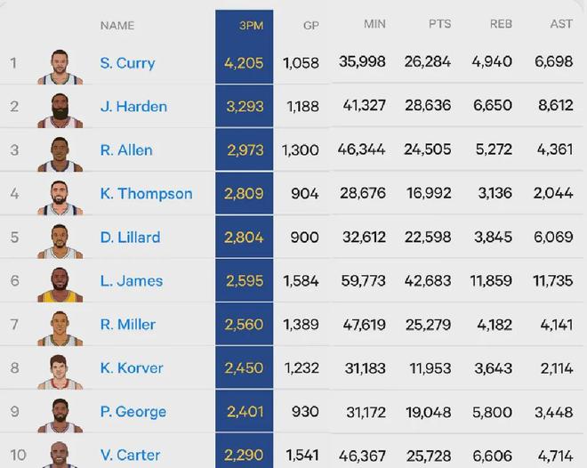 湯普森(2809)正式超越利拉德(2804),升至NBA史上三分球命中數榜單第4位。