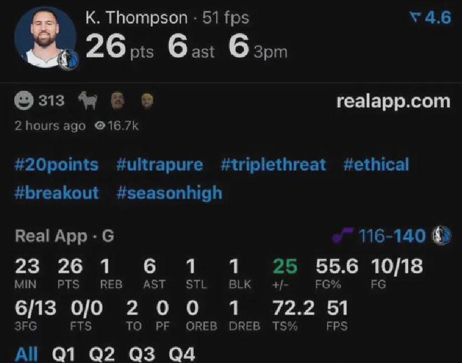 湯普森里程碑一戰于獨行俠144-122大勝爵士比賽,此役他投籃18中10,其中三分13中6獨攬26分外加6助。