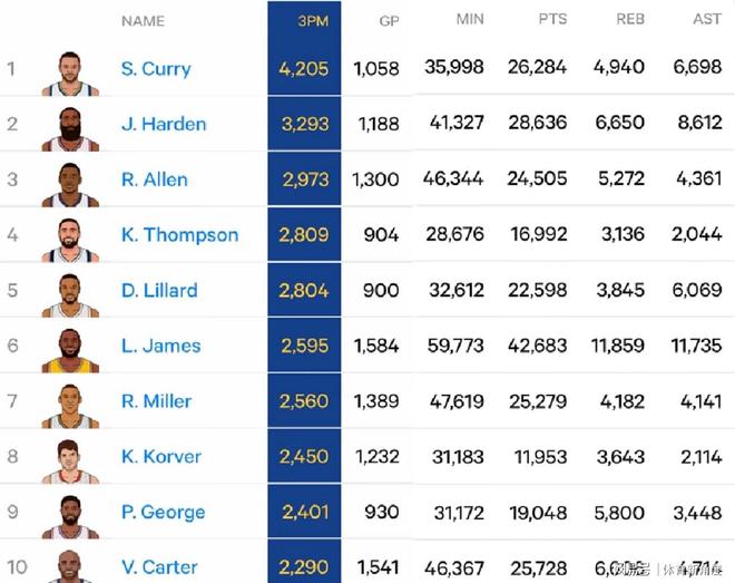 湯普森(2809個三分球)就像個神射手小火箭,“嗖”地一下,正式超越利拉德(2804個三分球),穩穩當當坐上了NBA史上三分球命中數榜單的第4把交椅,這簡直就是三分線上的“武林高手”大升級嘛!