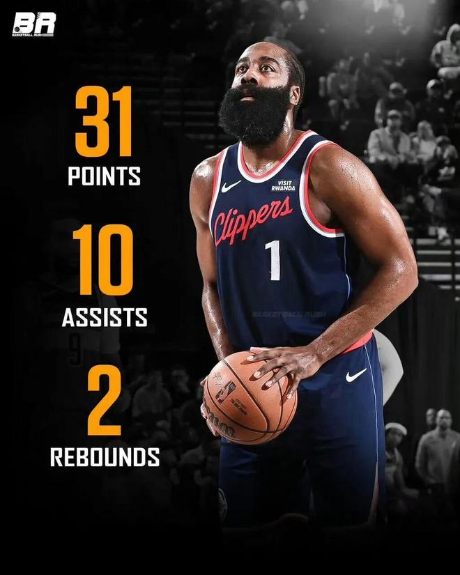 此役單核帶隊的哈登,出戰42分鐘,投籃27中10,其中三分15中2,收獲31分10助兩雙數據。