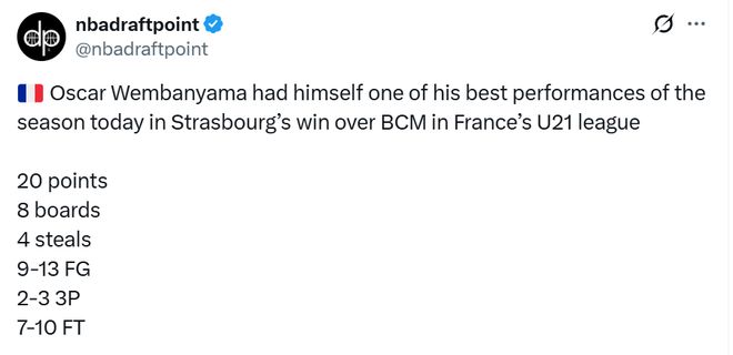 在今日法國U21聯賽斯特拉斯堡隊戰勝BCM的比賽中,文班亞馬的弟弟奧斯卡-文班亞馬表現出色,全場得到20分8籃板4搶斷,投籃13中9,三分3中2,罰球10中7。奧斯卡現年18歲,目前身高已經達到2米03,他將有資格在今年參加NBA選秀。他是一名全能型的前鋒。