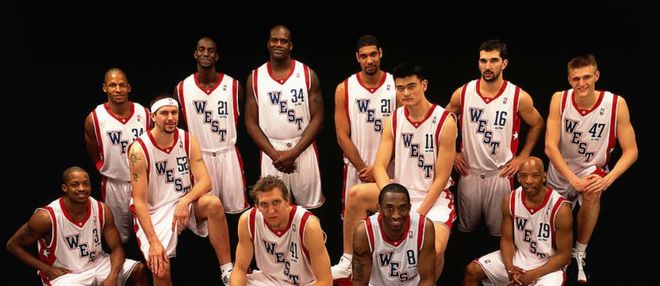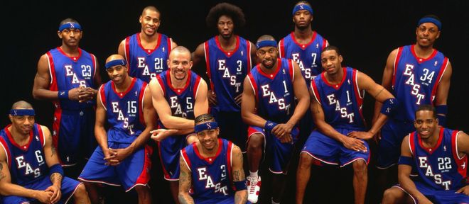詹姆斯的新秀賽季效力于克利夫蘭騎士隊,彼時的東部全明星首發陣容由艾弗森、麥迪、卡特、本-華萊士與杰梅因-奧尼爾構成。西部全明星首發陣容為弗朗西斯、科比、加內特、蒂鄧肯以及姚明,這份名單堪稱星光熠熠。
