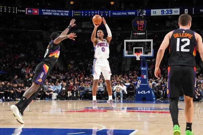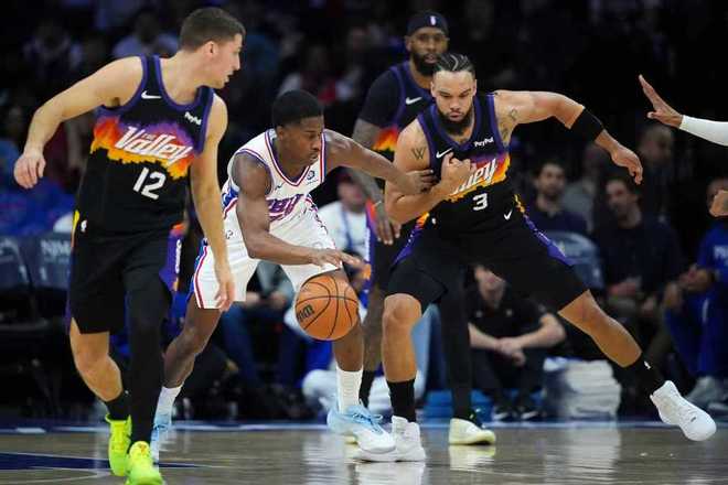 太陽過去兩次連續客場戰勝尼克斯與籃網收獲2連勝,76人上一次主場113-104戰勝步行者。本場太陽迎來杰倫-格林復出,76人缺少恩比德與喬治兩位核心。首節開局太陽2-8落后,太陽連追4分,烏布雷三分命中,太陽連追3分。雙方隨后持續纏斗至太陽17-19落后,烏布雷再中三分,太陽連追4分。76人一波8-0攻勢擴大9分優勢,太陽一波6-0攻勢追分,首節結束太陽27-30落后76人。首節太陽21中8,其中三分6中0,布克6中2得到9分;76人24中11,其中三分13中5,埃奇庫姆7中4得到10分與烏布雷3記三分11分,馬克西5中0得到0分。