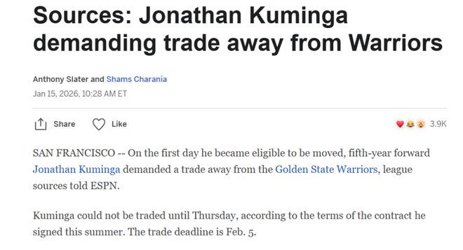 名記Shams在庫明加獲得交易資格第一天就曝出其團(tuán)隊(duì)已經(jīng)向勇士提出交易申請,勇士也一直積極為其尋找下家。