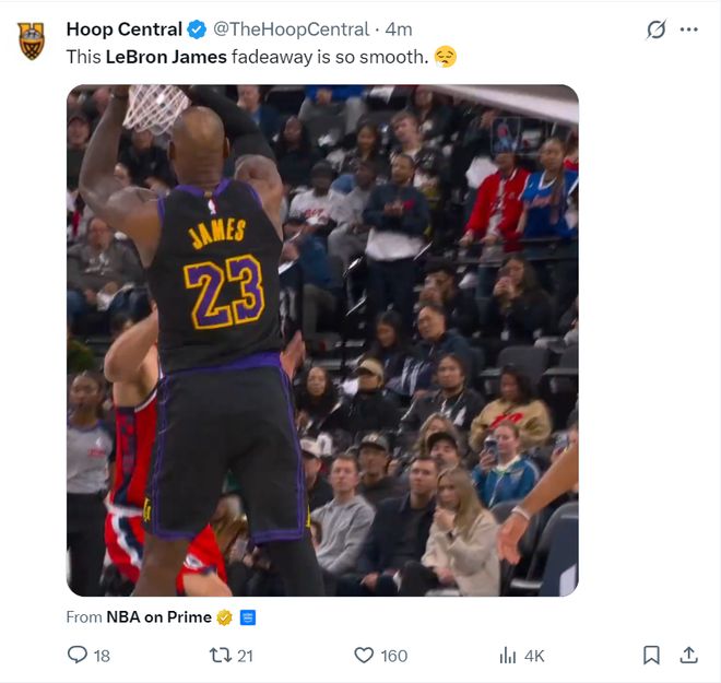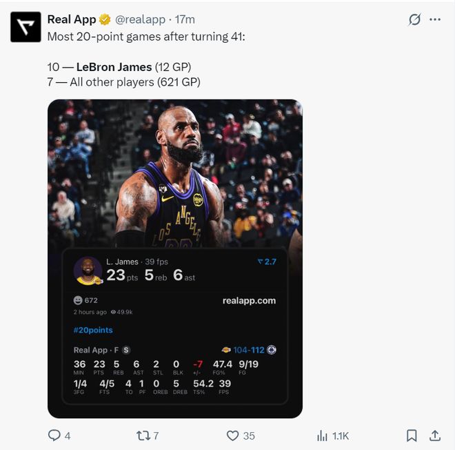 此役詹姆斯41歲后拿到第10場20+,其余的球員合計621場只有7次20+,詹姆斯再度刷新歷史首人紀錄。