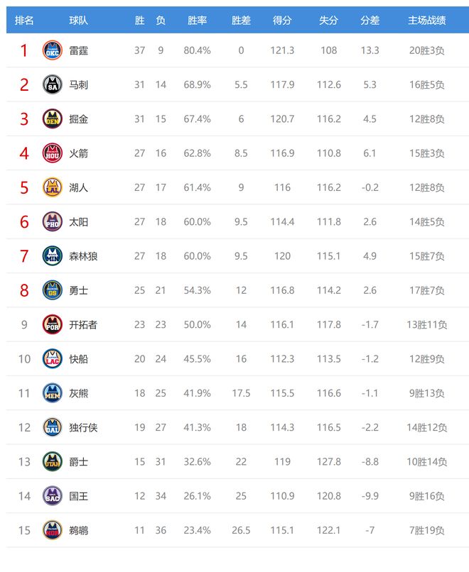 今日比賽后獨行俠、灰熊排名互換,其他西部球隊排名不變。