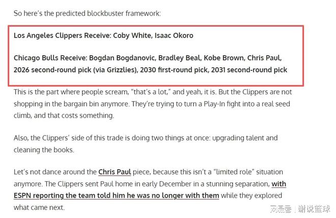 所以美媒結合現狀,策劃了一筆快船跟公牛的交易,可以換來兩名樂透秀,包括科比-懷特和艾薩克-奧科羅。而快船在交易方案里,送走四人包括博格丹、比爾、科比-布朗以及即將退役的保羅,再加上未來首輪簽,它來自于2030年,至于兩個次輪簽,因為自身價值相對較低,就算純粹的添頭了。