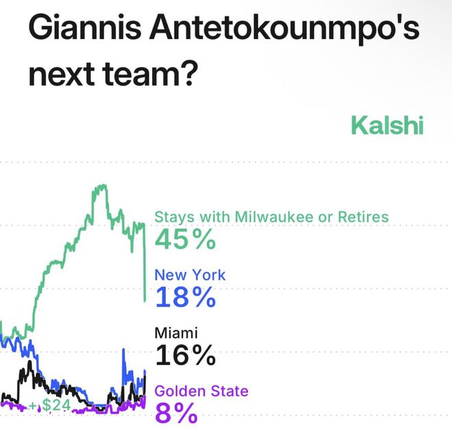 外媒Kaishi顯示,字母哥留隊概率降至45%,也就是說他離隊的概率已經達到55%,其中,尼克斯獲得字母哥的概率是18%,熱火是16%,勇士8%。