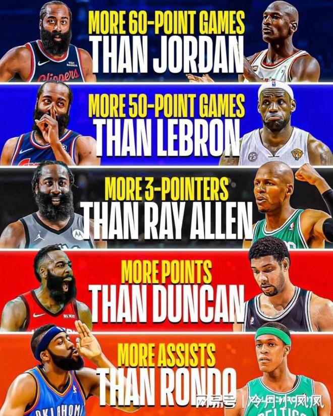 今日,美國(guó)知名體育媒體《Clutchpoins》發(fā)布了一組關(guān)于快船球星詹姆斯哈登與5位歷史級(jí)球星的幾項(xiàng)生涯數(shù)據(jù)對(duì)比。圖中顯示,哈登生涯60+場(chǎng)次(3次)多于邁克爾喬丹;哈登生涯50+場(chǎng)次(25次)多于勒布朗詹姆斯;哈登生涯三分命中數(shù)(3306記)多于雷阿倫;哈登生涯總得分(28780分)多于蒂姆鄧肯;哈登生涯總助攻(8665次)多于拉簡(jiǎn)隆多。值得一提的是,哈登也是歷史上唯一一位拿過3個(gè)得分王和2個(gè)助攻王的球員。