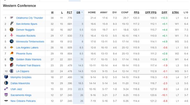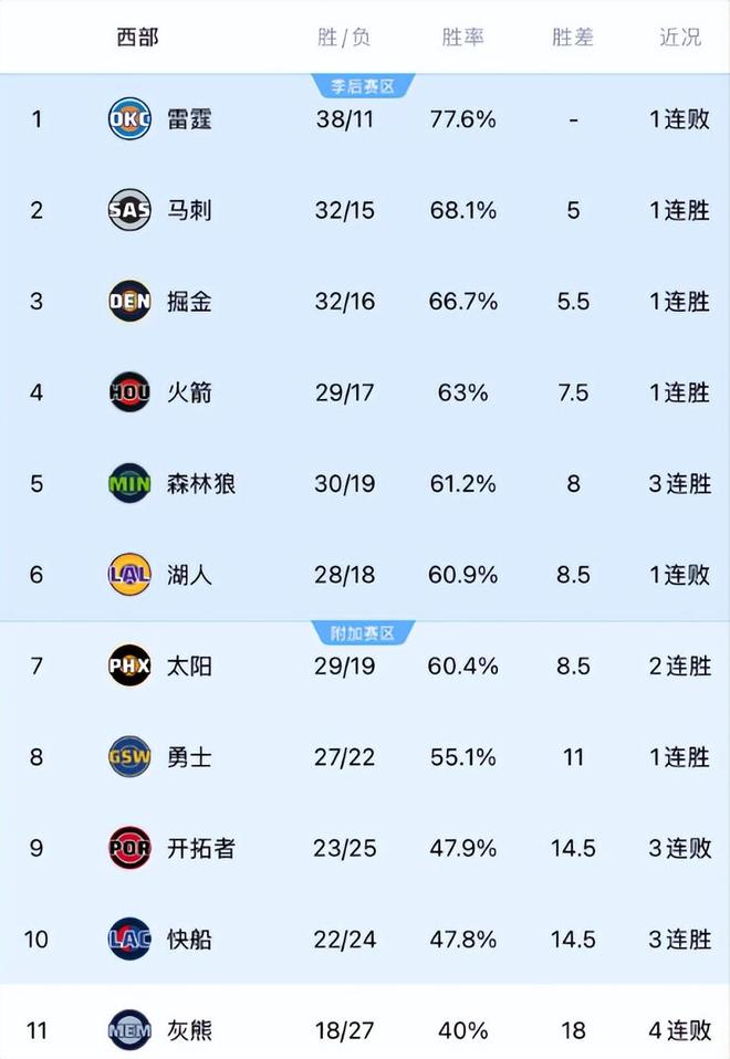 目前西部前十的排名:雷霆、馬刺、掘金、火箭、森林狼、湖人、太陽、勇士、開拓者、快船。