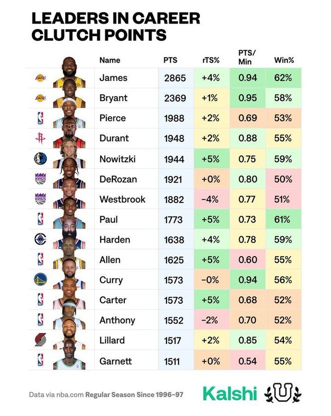 2月1日。有媒體統計并公布了一個數據,那就是關鍵時刻的總得分和勝率。關鍵時刻就是最后五分鐘內雙方比分差距在5分以內,這種時刻比末節和加時賽更能體現一個球員的心理素質和硬解能力。