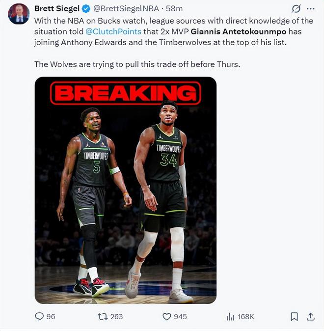 隨后NBA記者Brett Siegel報道,揚尼斯把加盟森林狼搭檔愛德華茲視為自己的首選,森林狼也正在努力推動揚尼斯的交易。