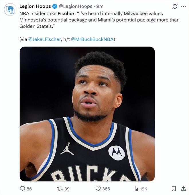 根據NBA記者杰克-費舍爾的報道,密爾沃基雄鹿隊認為熱火、森林狼的籌碼比金州勇士隊更好。
