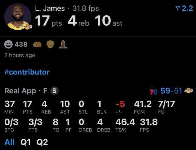 所幸,末節決戰階段詹姆斯爆發,他單節8中5得到10分,持續沖擊內線率領湖人反撲追分,從而最終驚險逆轉戰勝76人取勝。
