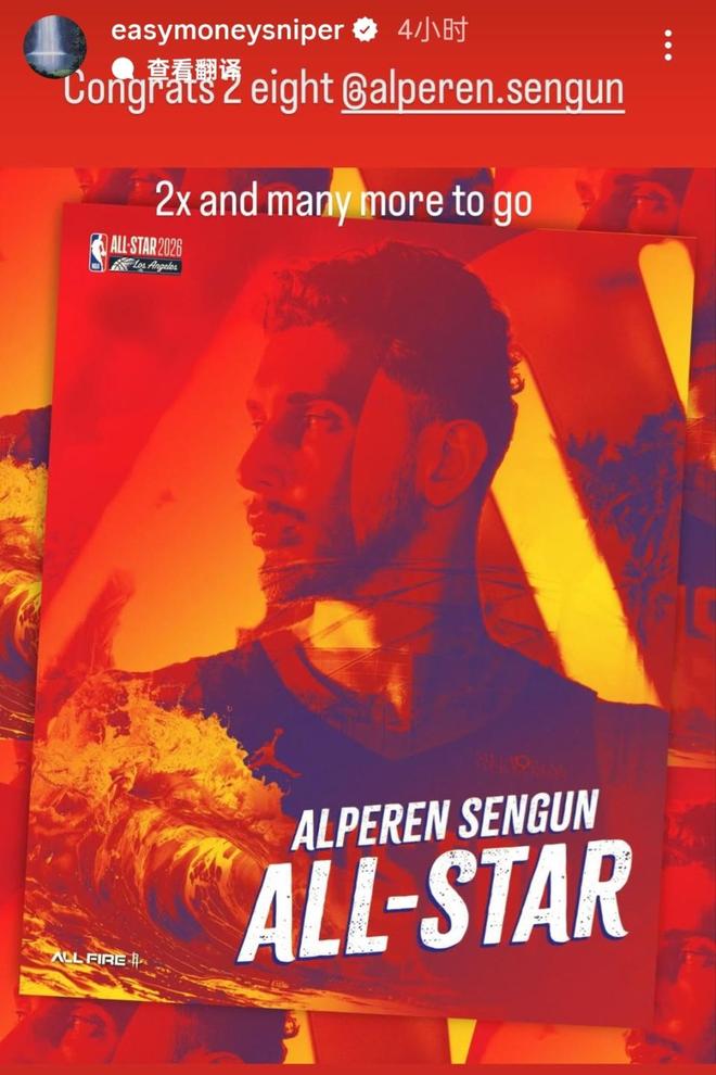申京本人在IG社媒上曬出了入選全明星的海報,配上兩個雙手合十的表情,顯然是對這次入選非常感恩。火箭隊友杜蘭特也曬出了同樣的海報,配文寫道:“祝賀28號申京,兩次(入選全明星)了,未來還會有更多次!”