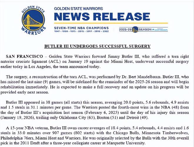 北京時(shí)間2月10日,金州勇士隊(duì)今日宣布,球隊(duì)前鋒吉米-巴特勒于今日早些時(shí)候在洛杉磯成功接受手術(shù)。巴特勒在1月20日對(duì)陣邁阿密熱火的比賽中右膝前十字韌帶(ACL)撕裂。