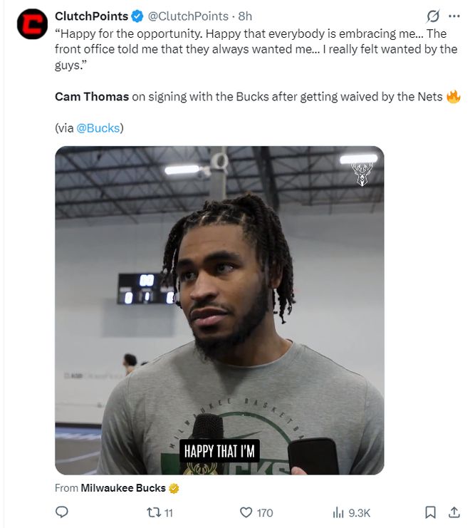 托馬斯在簽約雄鹿后接受采訪,他說道:很高興能有這個機(jī)會加盟雄鹿,也很高興大家接納了我,球隊管理層告訴我,他們一直都希望我能加入,我能感受到隊友們的認(rèn)可。
