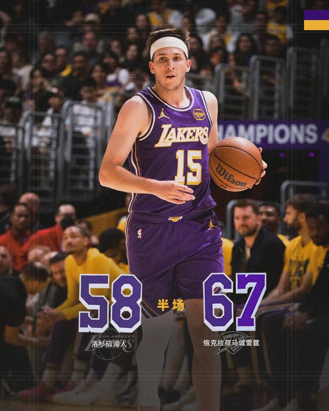 半場戰罷,雷霆67-58領先湖人9分。湖人上半場三分球15中4,其中第二節單節6中1。以賽亞-喬半場7中6高效砍下16分,湖人里夫斯12分6助,詹姆斯8分2籃板3助攻3失誤。易邊再戰,詹姆斯連續砍分,第三節單節4中3得到10分。