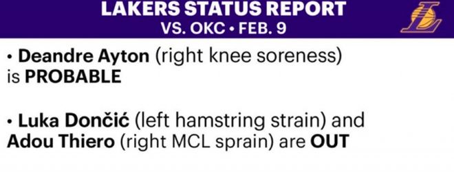 湖人東契奇因左腿筋傷勢繼續缺陣,蒂耶羅(右膝內側副韌帶扭傷)也無法出戰。