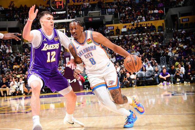 進入末節爭奪,斯馬特3分命中,卡魯索連得5分,斯馬特3分再中,杰倫威反擊上籃打進,切特一對一也有,詹姆斯上籃止血,杰倫威2分回應,詹姆斯上籃打進,杰林、杰倫威連得5分,斯馬特、八村壘回應5-0攻擊波,切特補籃打進,八村上籃回應,杰倫送關鍵中距離,詹姆斯丟關鍵三分,最終湖人不敵雷霆3連勝終結。