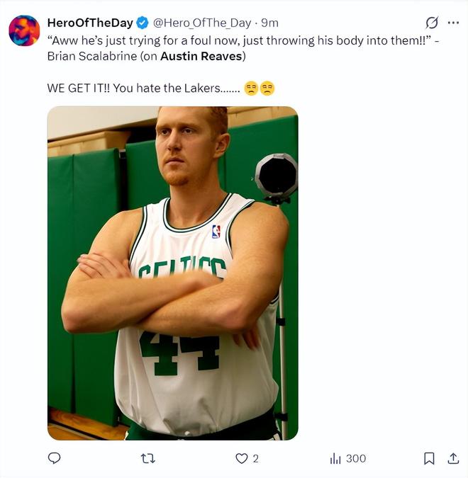 詹黑媒體:哎呀,里夫斯只是在試圖碰瓷,他簡直是用身體去撞擊對方。我只針對里夫斯,我們明白了,你們都討厭湖人隊。