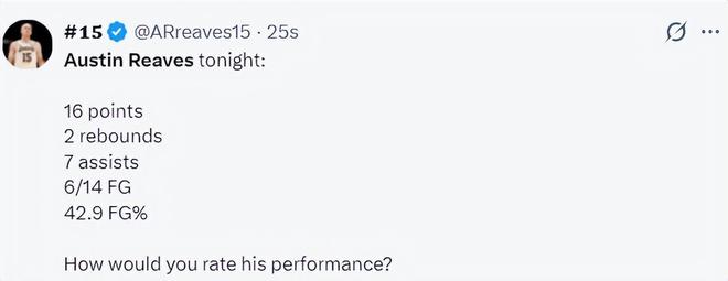 里夫斯在上一場對陣勇士的比賽中發揮一般,只拿到16分8助攻5籃板2搶斷沒有三分球進賬。可此役面對聯盟第一的雷霆,首節里夫斯就4中4拿到9分3助攻,還持球面對華萊士完成暴扣。