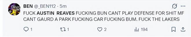 賽后湖人球迷也炮轟里夫斯:去XX的里夫斯,他根本不會防守,他在場上任何一個人他都防不住,FuX混蛋,去XX的湖人隊。