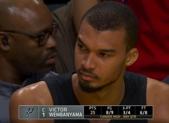 文班亞馬創造個人生涯單節得分新高紀錄,也創造馬刺隊史單節play-by-play時代單節最高分紀錄。