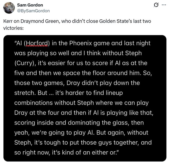 科爾表示主要原因是庫里缺陣,讓自己不得不在霍福德與追夢之間二選一,因為庫里缺席后球隊迫切需要霍福德拉開空間,所以選擇連續末節DNP追夢。