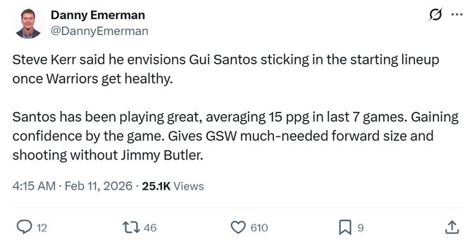 隊記Danny Emerman曝出,勇士主帥科爾公開表示哪怕球隊恢復健康,自己也會讓桑托斯繼續留在首發陣容。