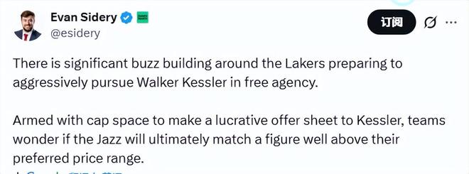 北京時間2月13日,據(jù)名記西德里報道,湖人將準(zhǔn)備在自由球員市場上全力追求爵士中鋒沃克-凱斯勒。湖人擁有充足薪金空間,可以為凱斯勒開出一份豐厚的邀請合同。聯(lián)盟多支球隊都在猜測:爵士最終是否會匹配一份遠高于他們心理價位的合同。