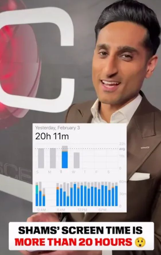 Shams之前曾經曬出過自己的手機亮屏時間,為了能夠精準第一時間報道新聞,他的手機亮屏時間超過20小時,他還調侃說“除非你不睡覺,要不你爆料不會比我快。”