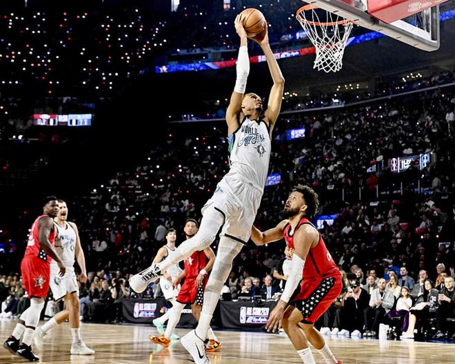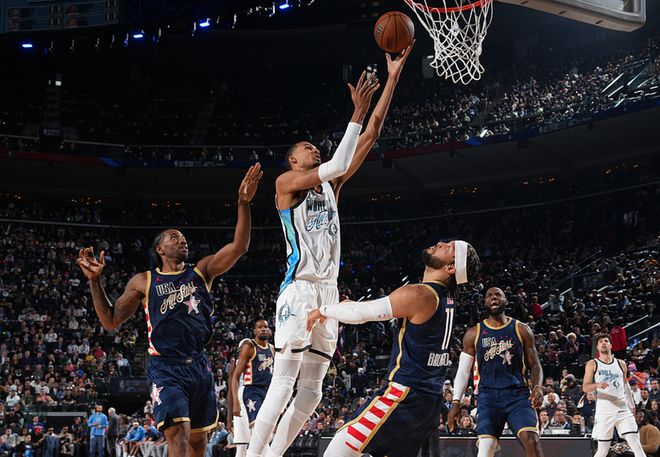 然后開打的是星條隊vs世界隊,打了12分鐘后星條隊48-45擊敗世界隊。星條隊方面:倫納德打滿12分鐘,13中11(三分7中6),3罰3中,得到31分3板2助,布倫森打了7分39秒,5中3(三分3中2)得到8分1板2助。世界隊方面:文班打了10分6秒,8中6(三分3中2),5罰5中,得到19分1板2助,穆雷打了9分51秒,7中3(三分3中2)得到8分2板4助。