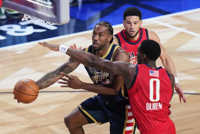 代表條紋隊出戰的萊昂納德在第二場42-40絕殺險勝星辰隊的比賽,他首發登場9分55秒,僅有7中2的低迷準星,其中三分3中1,依然得到5分5籃板2助攻2搶斷的全能數據。