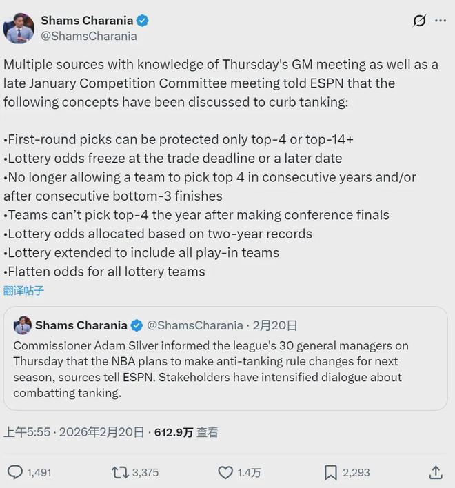 NBA官方計劃推出多項新規(guī)打擊故意擺爛:1、禁止球隊連續(xù)兩年獲得前四順位簽;2、連續(xù)兩年聯(lián)盟倒數(shù)前三的球隊不再獲得高順位簽;3.打進分區(qū)決賽的球隊,第二年不能獲得前四順位;4、根據(jù)兩年的綜合戰(zhàn)績,分配樂透抽簽概率。
