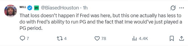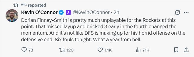NBA記者凱文-奧康納質疑烏度卡的用人:芬尼史密斯在火箭隊根本無法發揮應有水準,第四節丟上籃、多次投丟空位三分還有低級失誤,他防守端的特點也沒有展現出來,全場還吃下6次犯規。