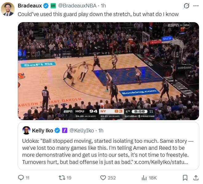 火箭2分惜敗尼克斯,而這場比賽火箭一度領先尼克斯達到18分之多,可在末節火箭18中5,命中率僅為27.8%且出現了9次失誤,他們幫助尼克斯打出33-15的攻防浪潮,尤其是最后5分鐘關鍵時刻球隊是接連出現低級的失誤,這場比賽引發了全美熱議。