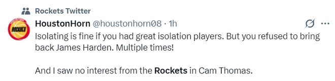 休媒:火箭隊很需要一位防守型中鋒與一個投手,一年前他們用探花簽選中了投手,可關鍵時刻卻不讓謝潑德登場。你總是說謝潑德防守端表現糟糕,可我們此役是輸在進攻端,單節丟33分還考慮防守嗎?至少讓球隊在進攻端有所作為吧。