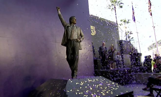 北京時間2月23日,湖人為球隊傳奇主教練帕特·萊利舉行雕像揭幕儀式。萊利的雕像造型是左手叉腰,右手高舉拳頭,顯得很有氣勢。昔日弟子韋德前來捧場,美媒調侃萊利的雕像比韋德的強多了。萊利雕像高2米41,重231公斤,是隊史第8位擁有雕像的人物。