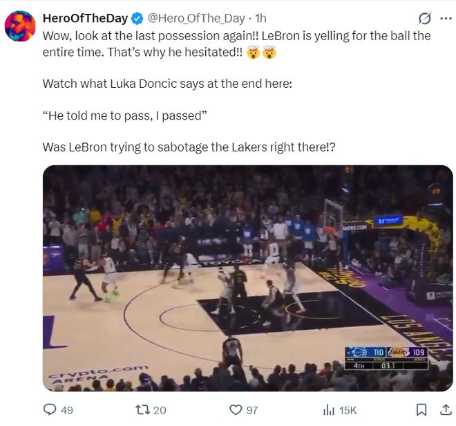 詹黑媒體HOTD曬出詹姆斯丟絕殺的瞬間寫道:哇,再看看最后那個畫面吧,詹姆斯正常比賽都在搶球權,這就是他猶豫不決的原因。勒布朗在場時故意破壞湖人的局勢。(詹黑媒體果然是欲加之罪何患無辭)