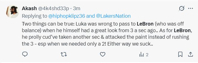 詹姆斯賽后也表示,東契奇應該投那是一個空位,傳給我時有點失去平衡了。
