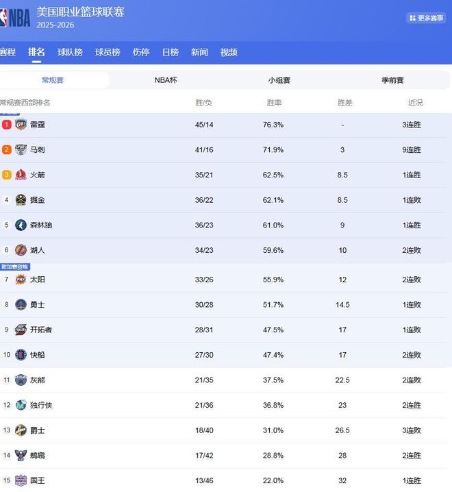 現在,咱們就來看看西部的最新排名:差距僅1.5場,4隊搶第3;勇士沖7有望,快船掉第10!