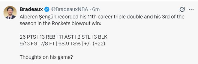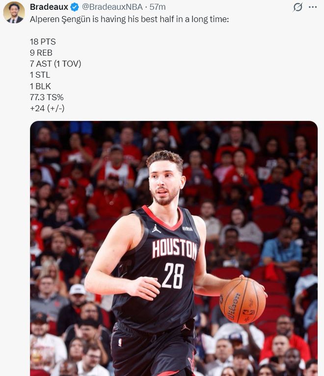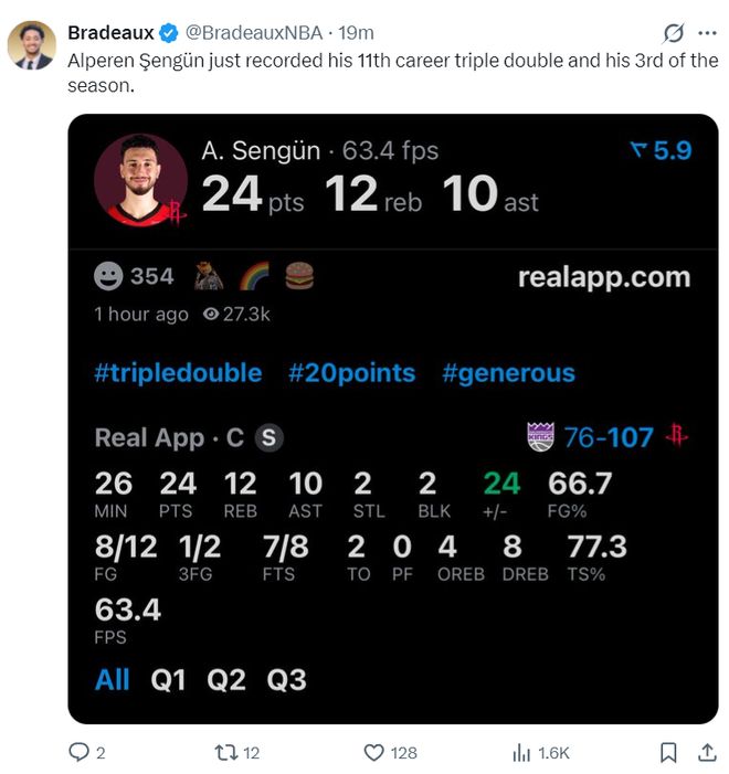 此役阿爾佩倫-申京表現非常出色,首節9分鐘里他就已經3中3拿到6分4籃板4助攻,次節9分鐘里更是6中3+三分1中1拿到12分5籃板3助攻,半場18分9籃板7助攻1搶斷1蓋帽1失誤,真實命中率77.3%,正負值+24。國王的內線群根本無法限制他分毫。