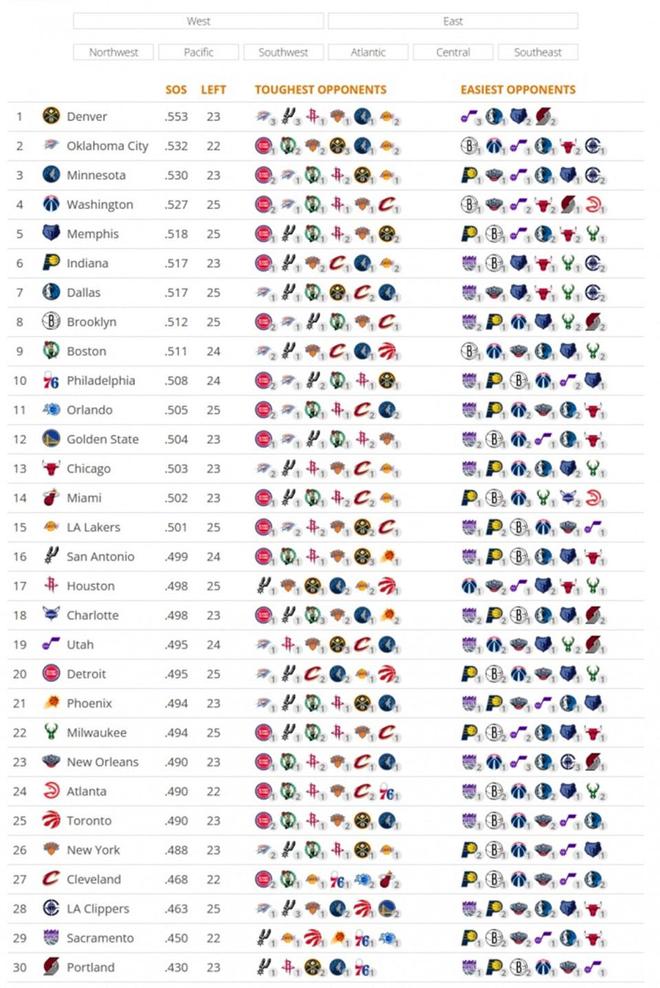 其中掘金與雷霆難度高居前二值得關(guān)注,尤其是考慮到兩支球隊還將3次正面相遇,這三場比賽的結(jié)果不僅將影響兩隊潛在對決的心理優(yōu)勢,也將極大影響西部最終的排名局勢。
