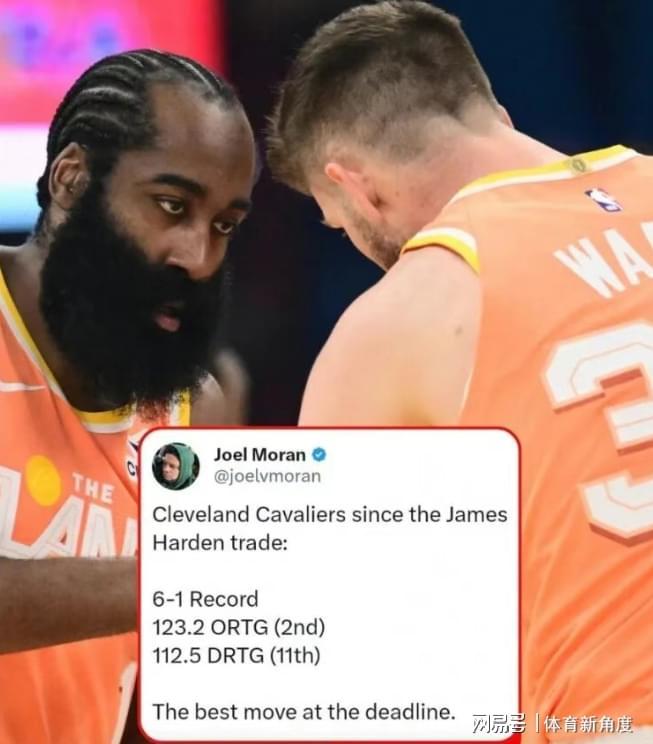 到目前為止,哈登代表騎士出戰了七場比賽。他場均登場32.1分鐘,能貢獻18.9分、4.6個籃板和8次助攻,三項命中率分別達到了49.4%、48.8%以及86.7%。在這七場比賽里,騎士取得了6勝1負的佳績,進攻效率高達123.2,排在聯盟第二,防守效率112.5,位列聯盟第11。不得不說,哈登和騎士的這次合作,堪稱今年交易截止日前最成功的操作。