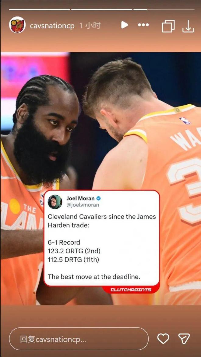 目前為止,哈登為騎士出戰七場比賽,場均上陣32.1分鐘,貢獻18.9分4.6板8助,三項命中率49.4%、48.8%和86.7%,期間球隊6勝1負、進攻效率123.2聯盟第二,以及防守效率112.5聯盟第11,雙方的合作被公認為今年交易截止日前的最佳操作。