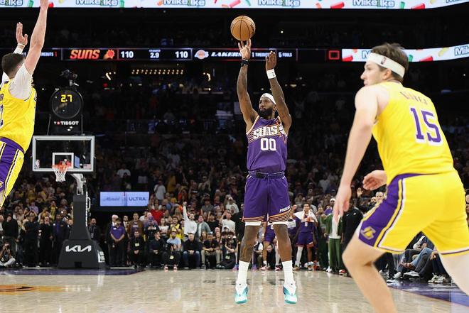 下半場,湖人一度拉開分差,不過替補太陽的替補后衛阿倫在外線表現強勢,連續命中三分,幫助太陽反超比分。最后一節,太陽延續火熱手感,一度將分差拉開,不過關鍵時刻,東契奇再次挺身而出連續命中三分球,在最后1分鐘內將比分追至110平。決定勝負的最后一個回合,太陽通過傳導將球送到羅伊斯·奧尼爾手中,他手起刀落命中三分球。回過頭來,湖人在最后0.9秒將球送到里弗斯手中,但是這位射手沒有把握住空位戰術的機會,湖人就此吞下三連敗。