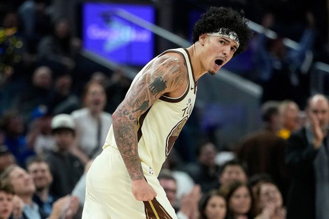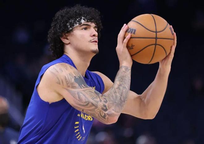 桑托斯身高2米01,臂展2米13,擁有標準的NBA鋒線身材,是2022屆的55號秀,目前23歲,生涯前兩個賽季,他都是勇士的邊緣輪換: