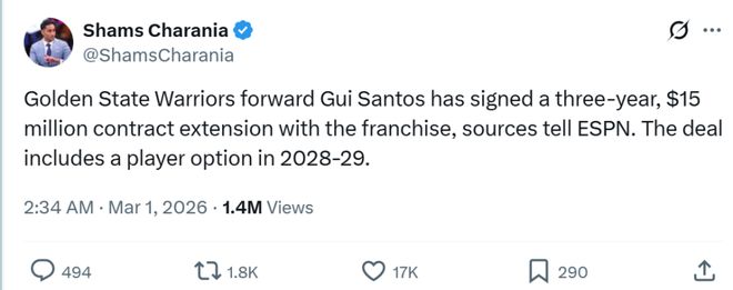 在湖勇焦點戰開打前,名記Shams曝出勇士提前以一份3年1500萬美元合同續約了桑托斯,合同包含28-29賽季球員選項。