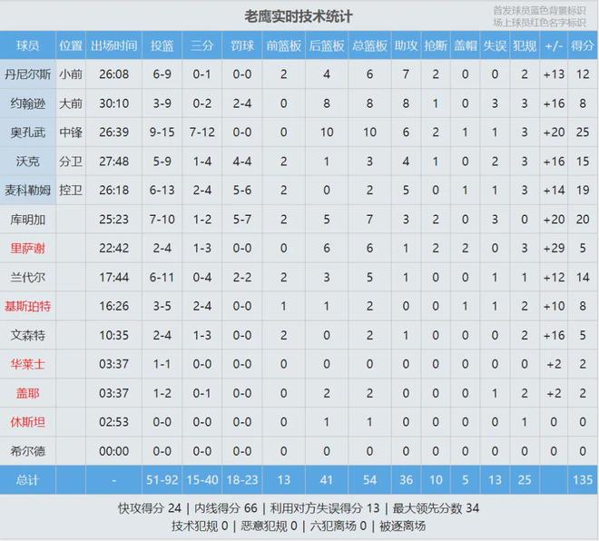 老鷹31勝31負東部第9,領先第10黃蜂0.5個勝場。老鷹新援庫明加替補出戰25分鐘,投籃10中7,三分2中1,罰球7中5,砍下20分7籃板3助攻2搶斷3失誤0犯規,正負值+20并列全場第二!第四節還剩3分多鐘,庫明加隔扣楊瀚森。